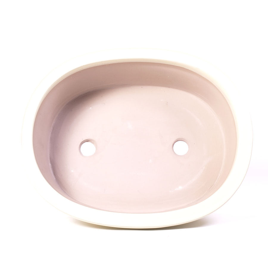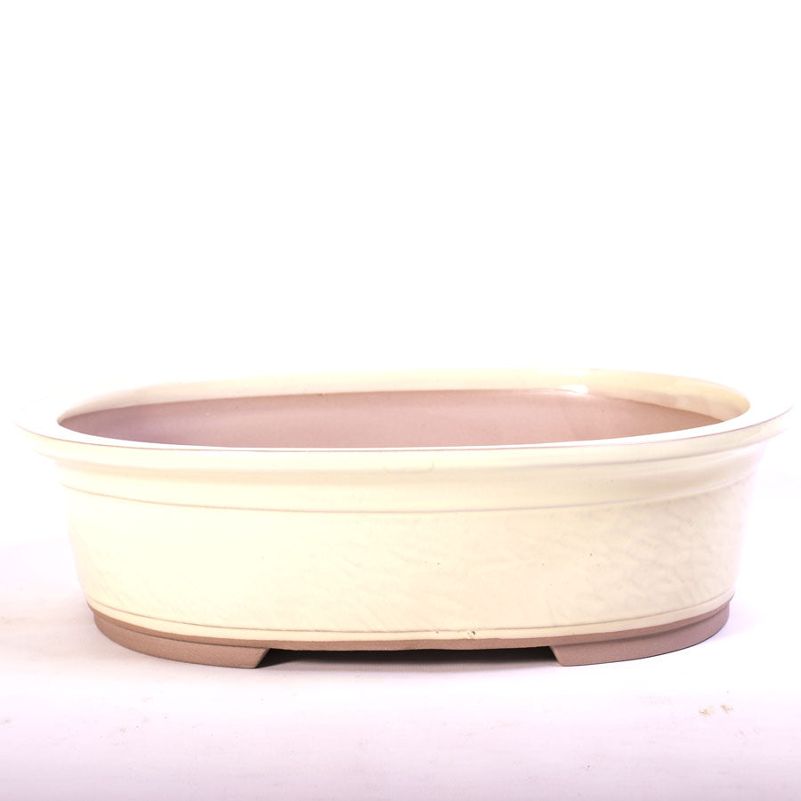Pot ovale à bonsaï, couleur crème, modèle mi-hauteur avec rebord extérieur et paroi brute à l'aspect vermoulu. Dimensions (longueur x largeur x profondeur) : 35 cm x 27 cm x 10 cm. Dimensions intérieures : 30,5 cm x 23 cm. Qualité japonaise, très résistant au froid.