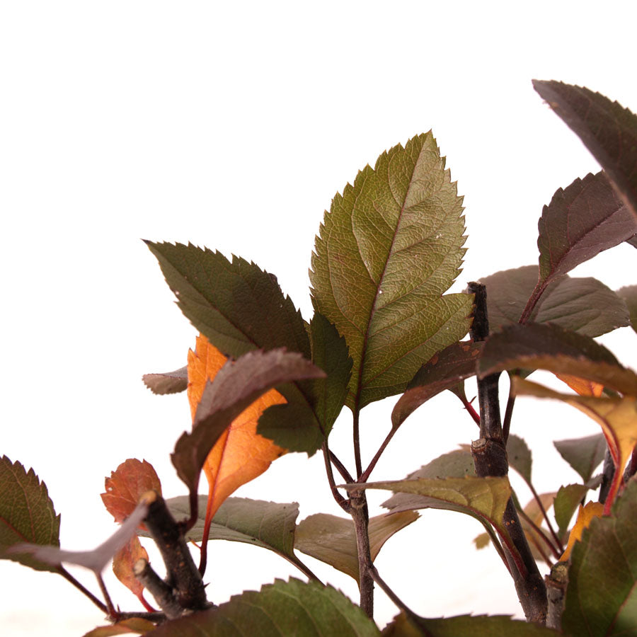 Ce pommier à feuilles rouges est une variété indigène et rustique, caduque en hiver. Au printemps, il produit de magnifiques fleurs roses qui, après pollinisation, donnent naissance à des pommes rouges jusqu'à l'automne. La photo est représentative d'un petit lot de bonsaïs ; l'exemplaire livré peut légèrement différer. L'âge estimé de ce bonsaï est de 7 ans. Ce bonsaï est livré avec un pot et des instructions d'entretien détaillées. Cette espèce d'arbre est destinée à l'extérieur et a besoin du cycle des saisons pour sa croissance et son repos.